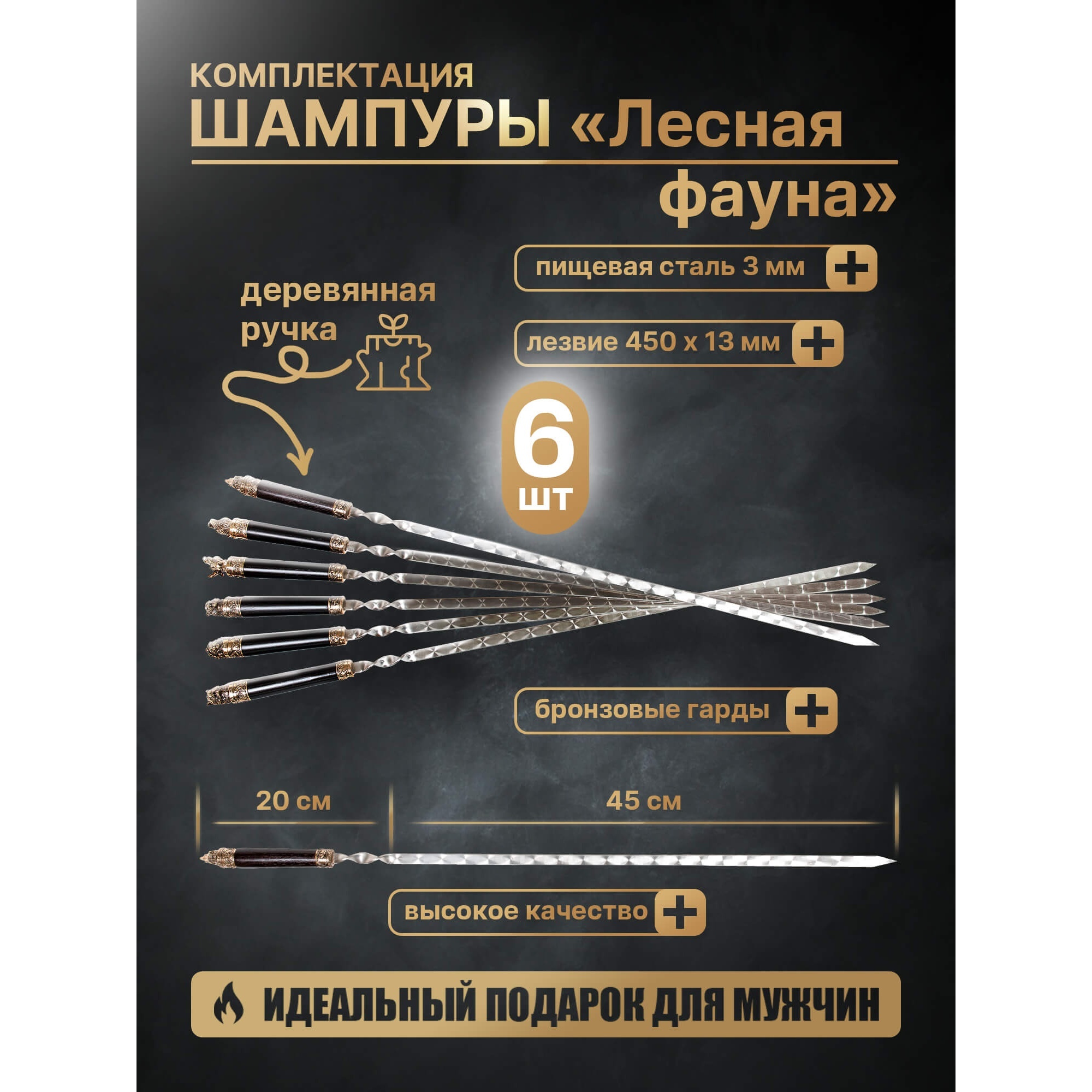 Каждый элемент набора выполнен с особым вниманием к деталям. Шампуры и нож не только функциональны, но и придают особый шарм процессу приготовления шашлыка. Компактный футляр обеспечивает удобное хранение и транспортировку всех предметов.