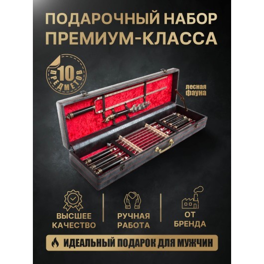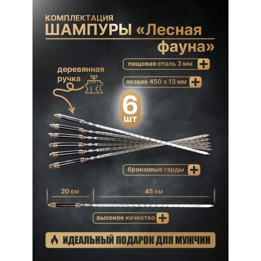 Футляр Гранд Пикник «Лесная фауна» — это изысканный набор для истинных ценителей пикников и барбекю. В комплект входят элегантные шампуры размером 13х45х3 мм (6 штук), практичная вилка, стильный шашлычный нож и мангальница.