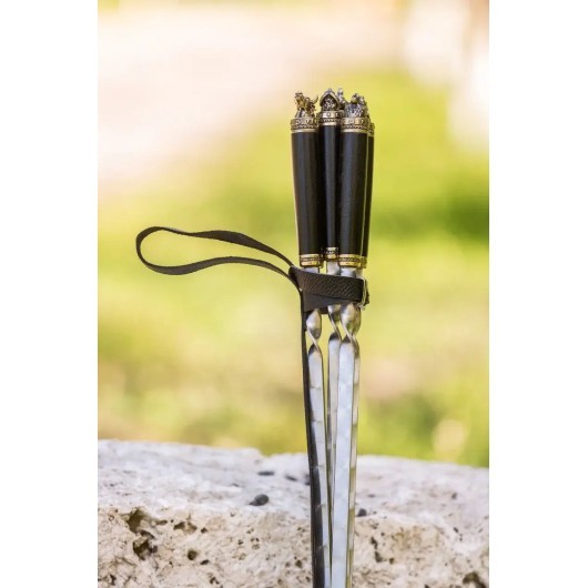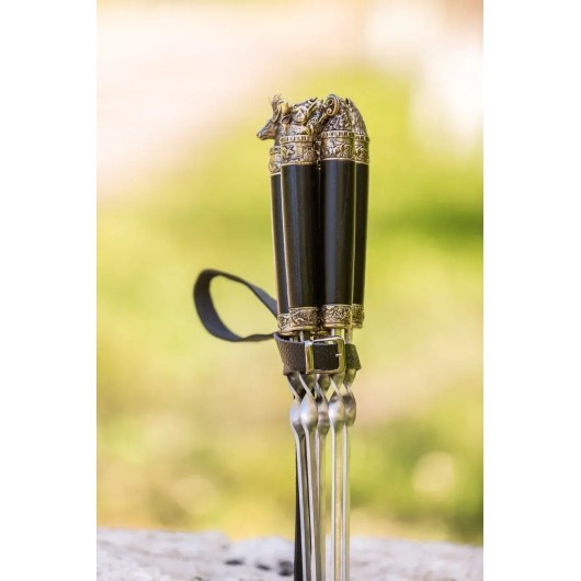 Шампуры упакованы в стильный колчан, что делает набор удобным для хранения и транспортировки. Такой комплект станет настоящим украшением любого застолья и незаменимым аксессуаром для дачи, отдыха на природе или охоты.