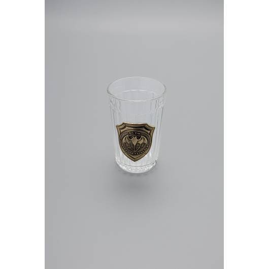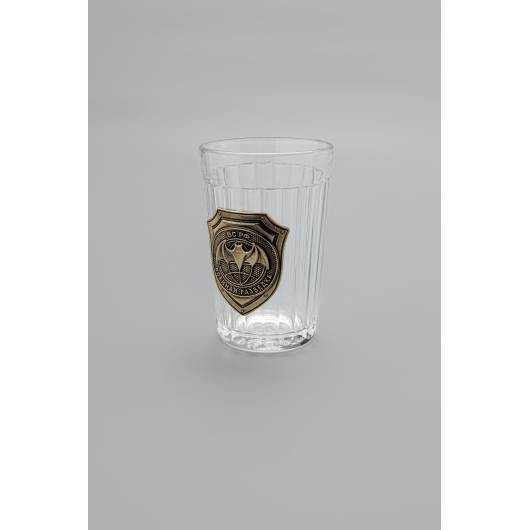 Гранёный стакан «Военная разведка» — стильное сочетание классического стеклянного стакана и декоративного бронзового герба. На лицевой стороне изделия расположен герб «Военная разведка», выполненный из бронзы, что придаёт ему особую выразительность и уникальность.