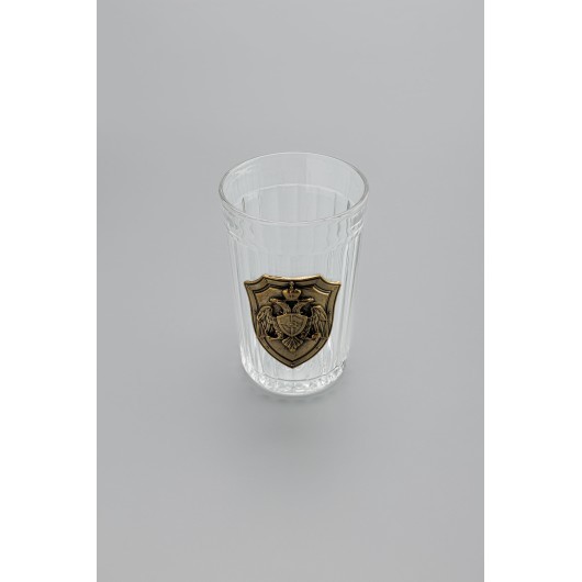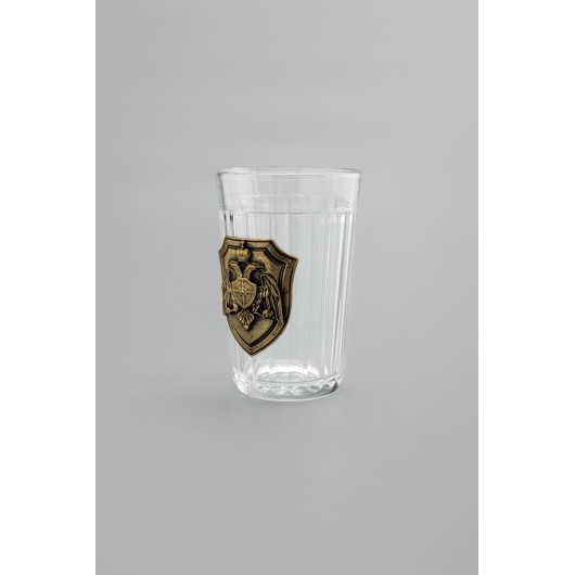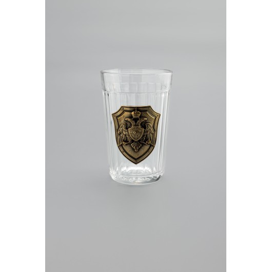 Гранёный стакан «МЧС» изготовлен из прочного стекла и украшен декоративным бронзовым гербом Министерства чрезвычайных ситуаций. Герб закреплён непосредственно на стакан, без подстаканника, что делает изделие удобным в использовании и стильным по дизайну.